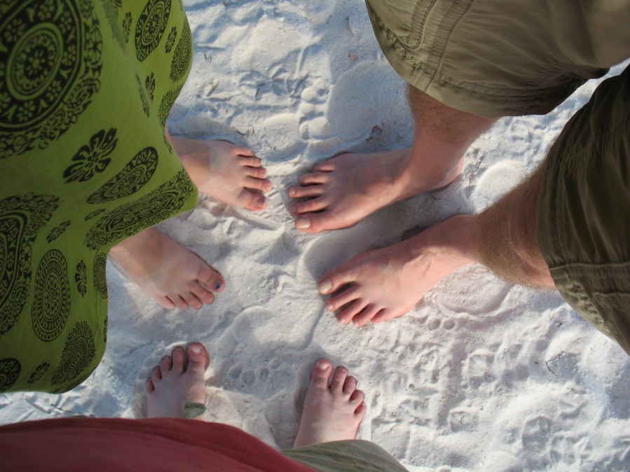 These are the feet of my beloved travel companions, my husband and daughter (mine snuck in there too). The photo was taken on a beach on the Gulf Coast of Florida near Tampa, whose name I can never remember. We’ve travelled all over the US together, and hope to finish seeing all 50 states by the end of the decade. (When my son lived at home he travelled with us, too, but he’s a married man now, with a new beloved traveling companion.)
